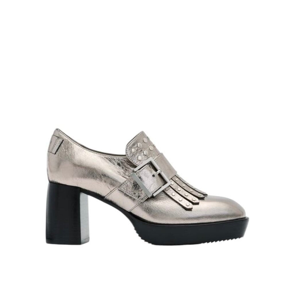*ALLSAINTS Zia Distressed Metallic Leather Studded Fringe Buckle 3" Stacked Heel Loafers, Size 38