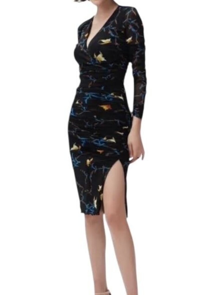 *DVF Rochelle Mesh Butterfly Tie Long Sleeve V-Neck Ruched Body Midi Dress, Size S