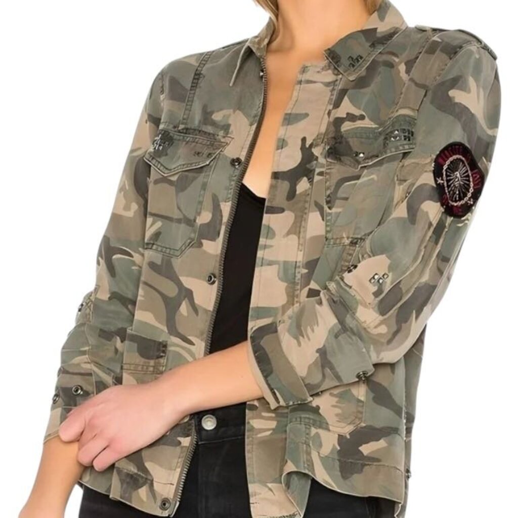 *PAM & GELA Twill Camo Stud Trim Long Sleeve Collared Zip-Up Shacket Army Jacket, Size S