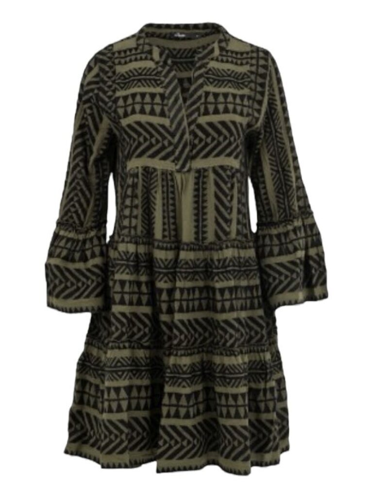 *Devotion Twins Ella Embroidered Geometric 3/4 Flared Sleeve Split Neck Tiered Mini Dress, Size XS