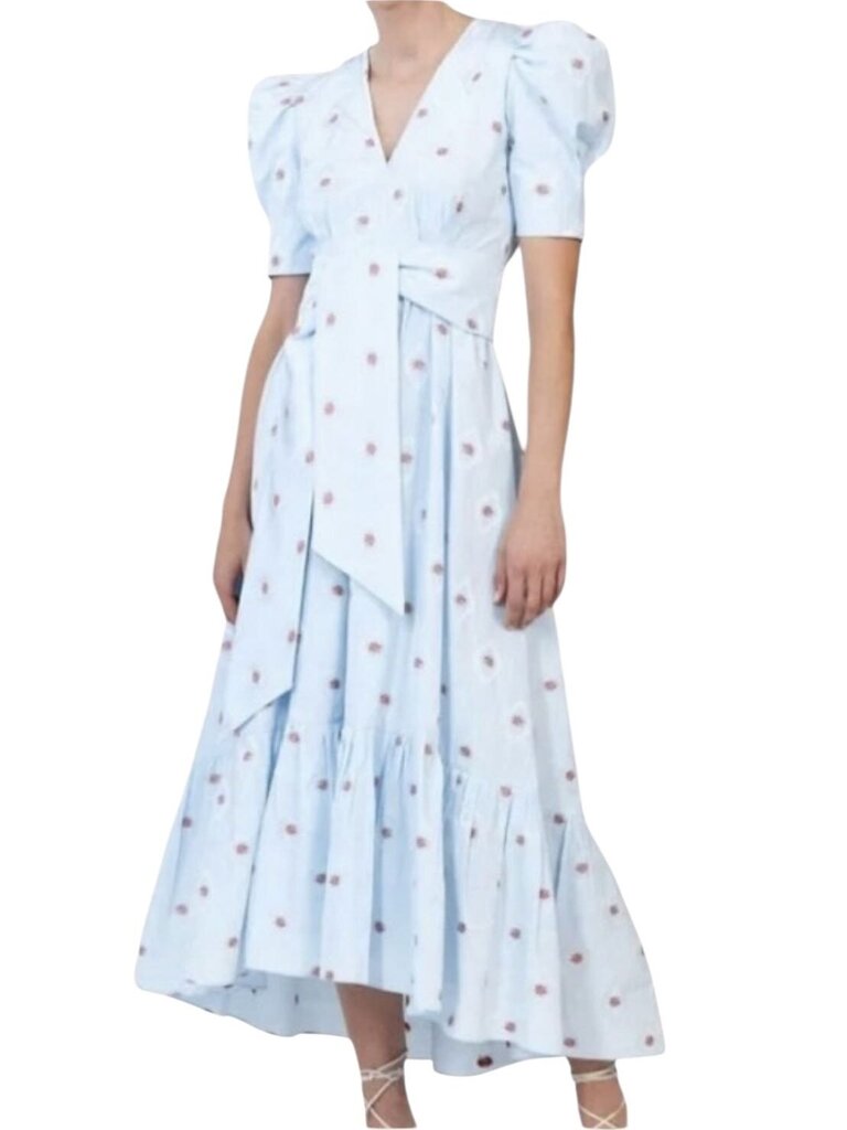*Hunter Bell Rebekah Taffeta Blue Blossom Floral Short Puff Sleeve V-Neck Tie Waist Tiered Hem Midi Dress, Size 8