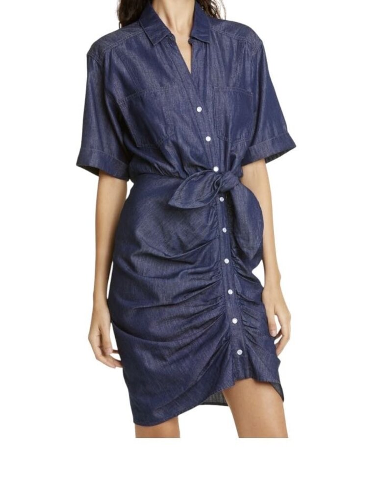 ^Veronica Beard Hensley Cotton Denim Short Sleeve Collared Ruched Tie Waist Mini Dress, Size 6
