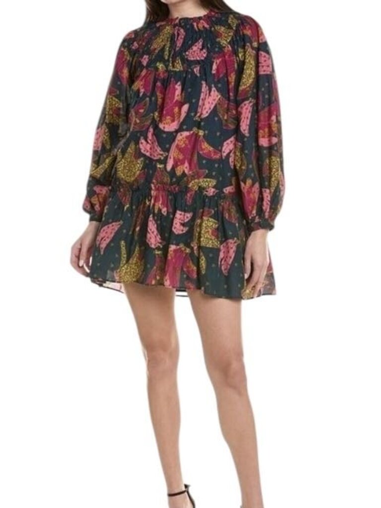 *Farm Rio Patchwork Bananas Cotton Balloon Sleeve Ruffle Yoke Mini Trapeze Dress, Size S