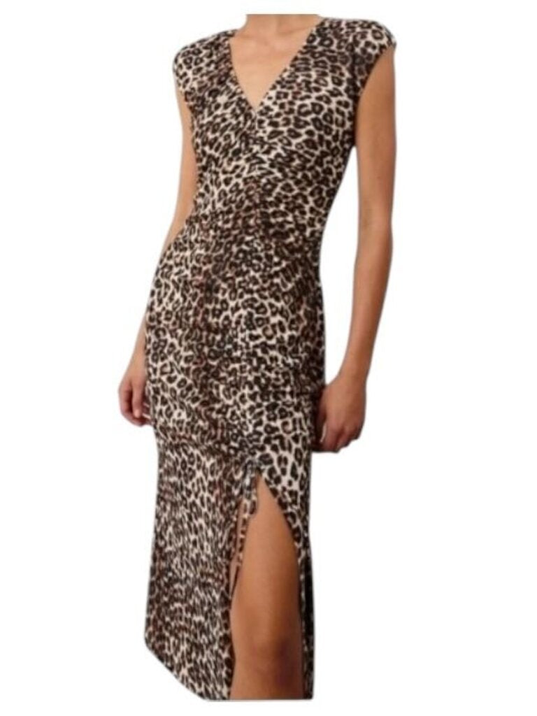 *Rails Auren Nala Leopard Cap Sleeve V-Neck Ruched Front Sheath Midi Dress, Size L