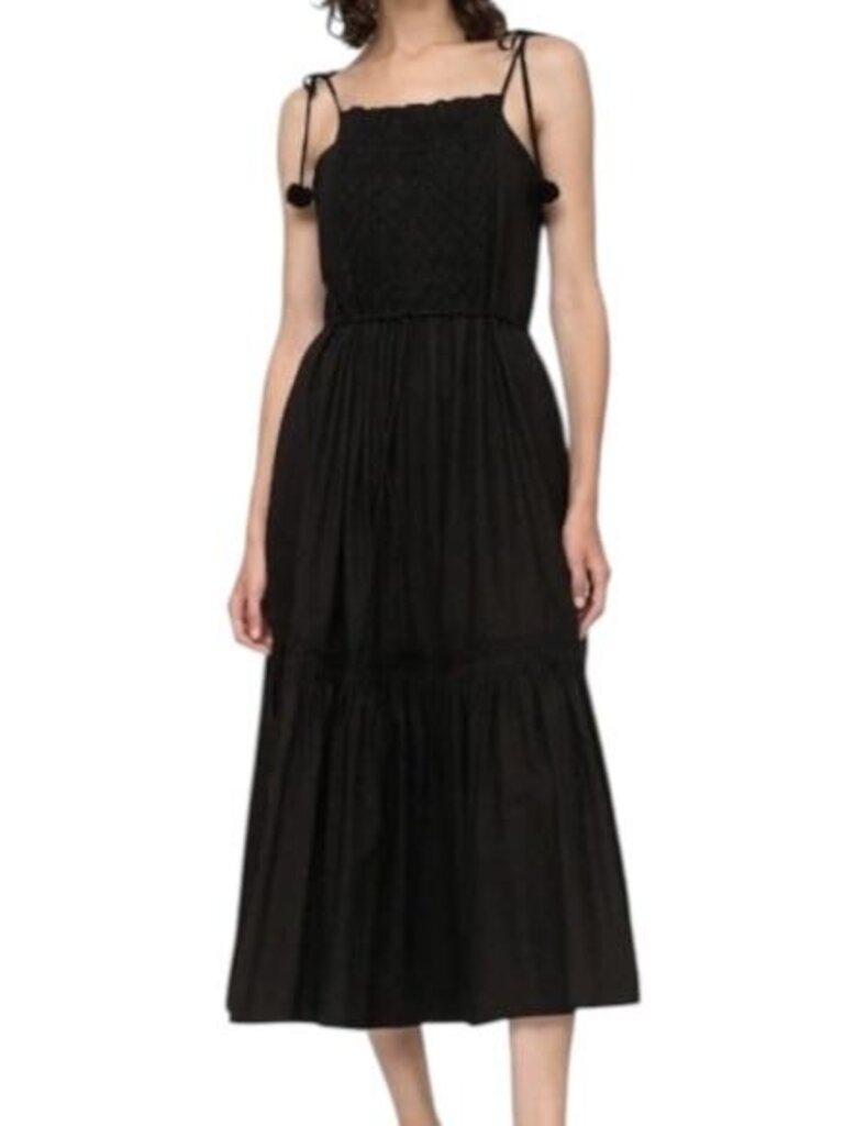 *Sea NY Willa Cotton Pom Pom Tie Shoulder Cami Square Neck Smocked Tiered Midi Dress, Size XXS