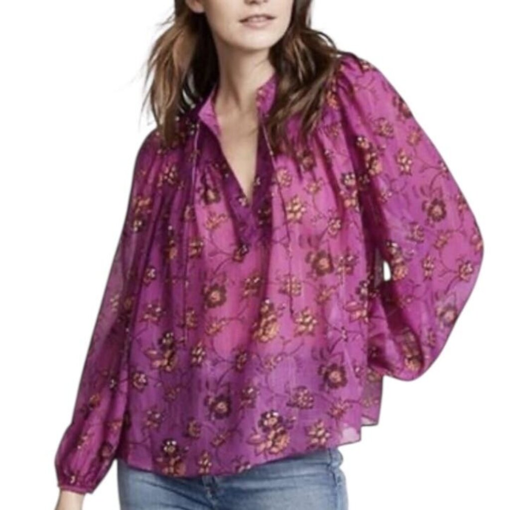 *Ulla Johnson Constance Silk Chiffon Metallic Floral Balloon Sleeve Tie Split Neck Top, Size 4