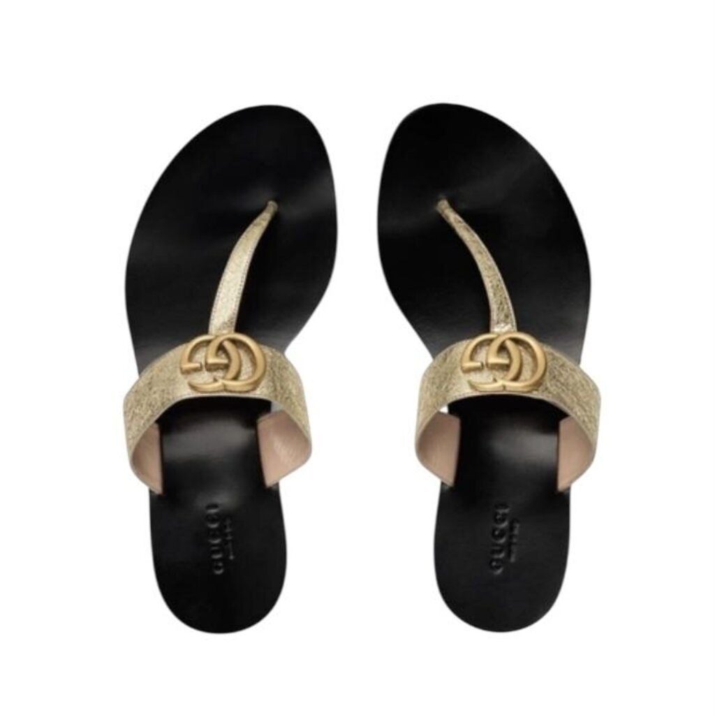 *Gucci Lifford Double GG Marmont Logo Metallic Leather T-Strap Thong Flat Sandals, Size 40